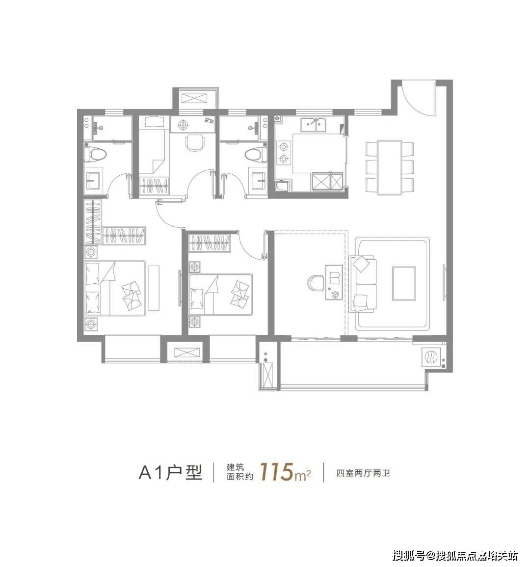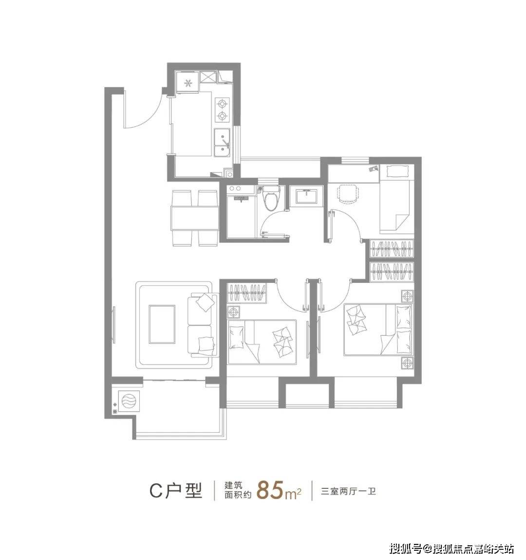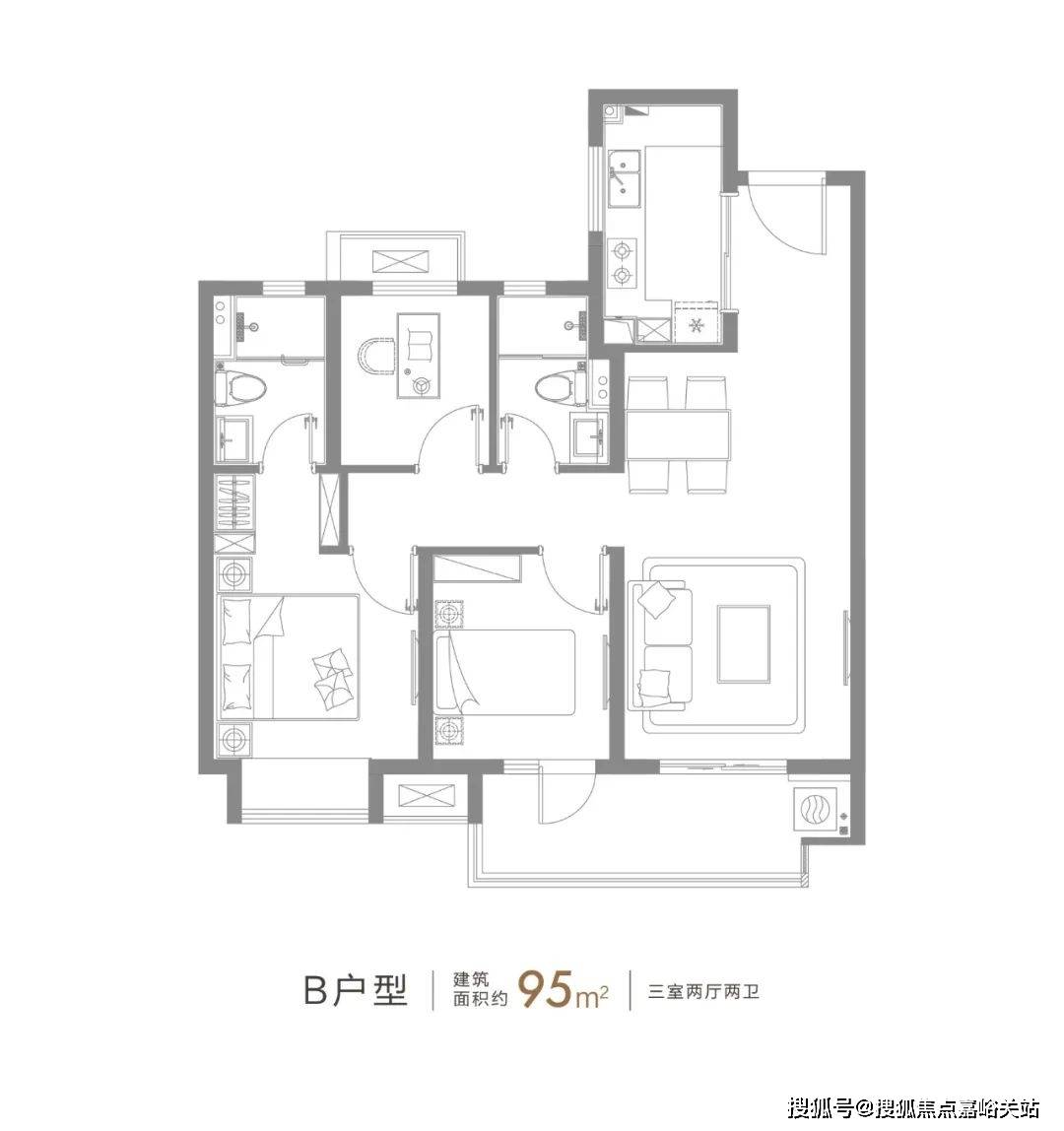 约95㎡的3房2厅2卫户型,这个户型的适用性太高了。能业从从二界到二胎家庭的全生命周期需求。